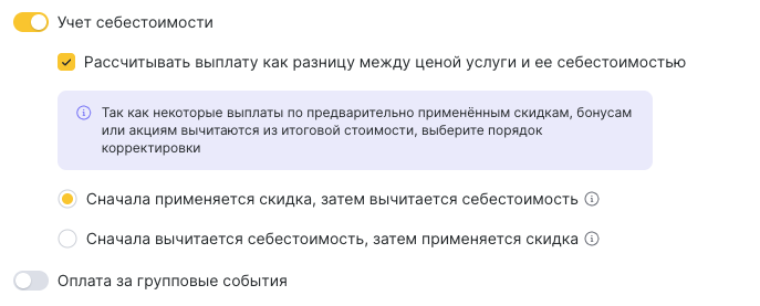 Активируйте опцию Учет себестоимости, чтобы выплата рассчитывалась от цены услуги за вычетом себестоимости (например, себестоимость материалов).