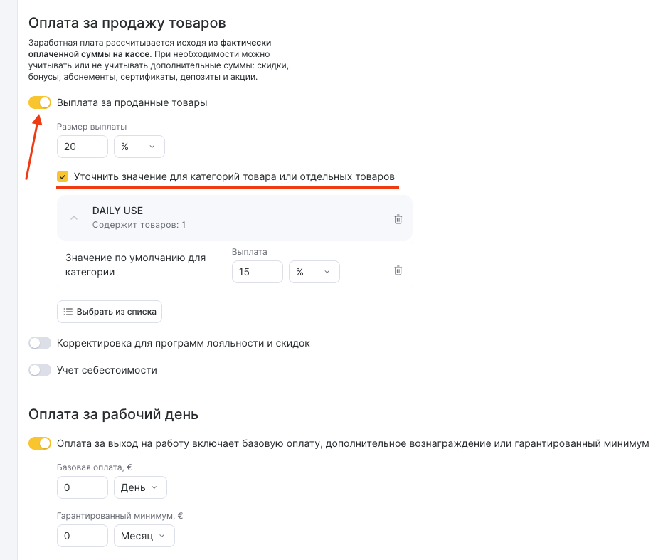 - Активируйте Выплата за проданные товары, если сотрудники получают комиссию с продаж розничных товаров.