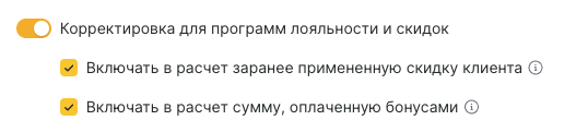 - Заранее примененная скидка клиента — учитывать ли сумму, которая была уменьшена из-за скидки.