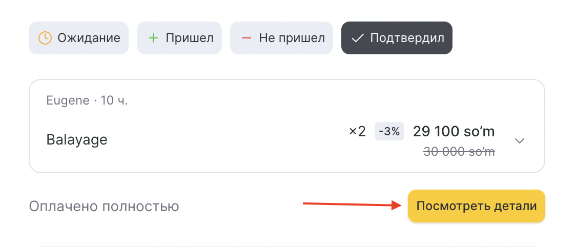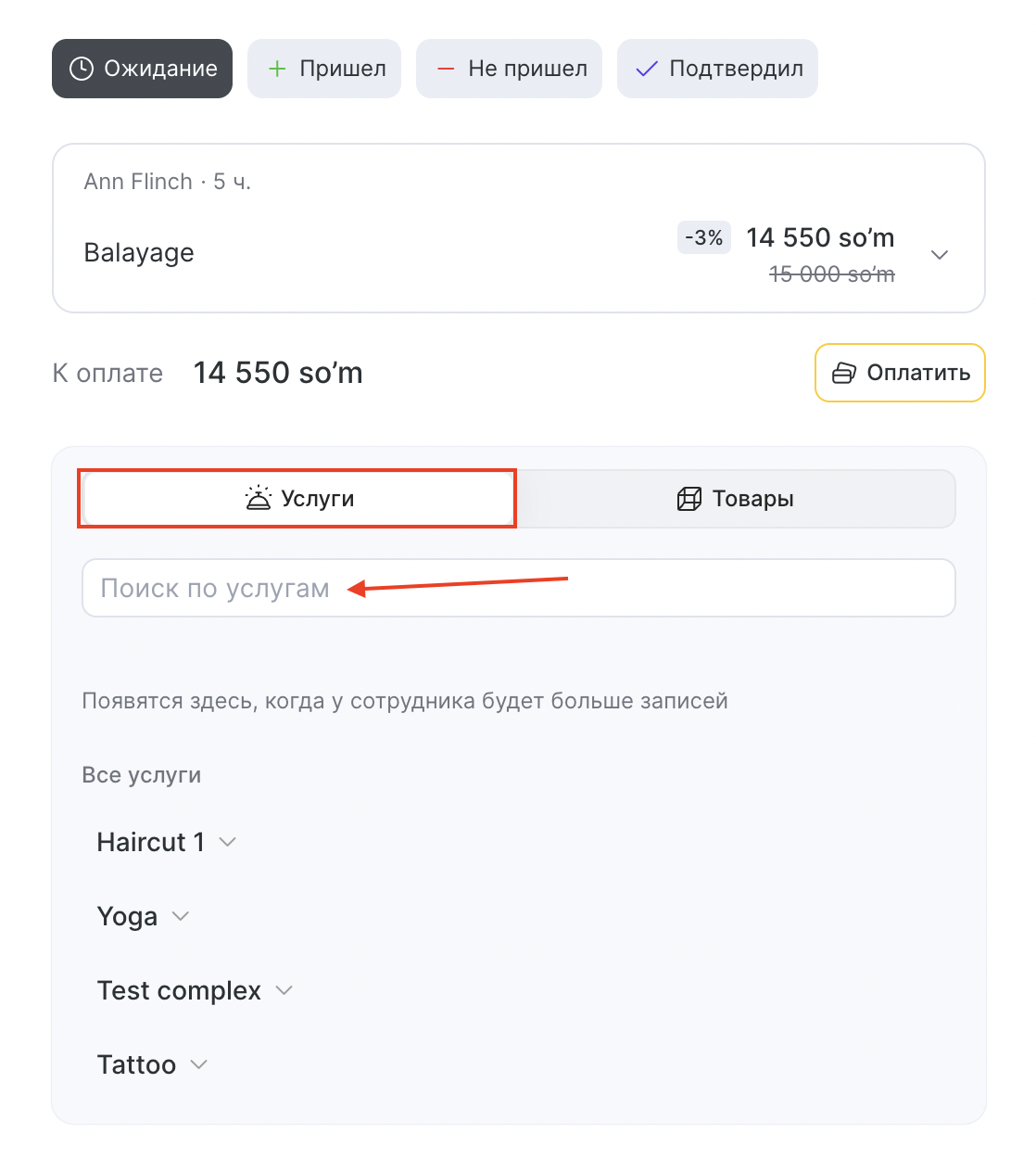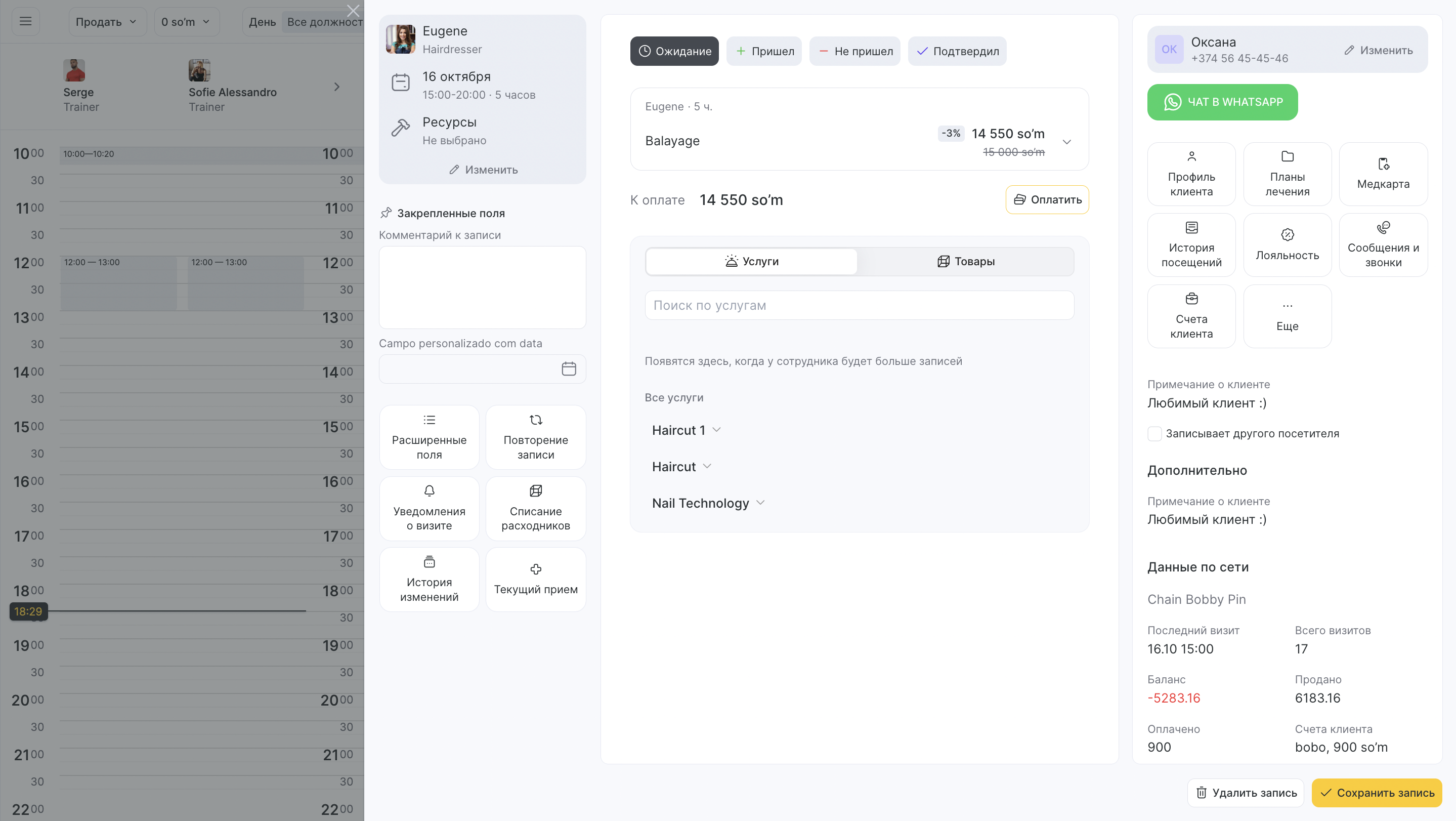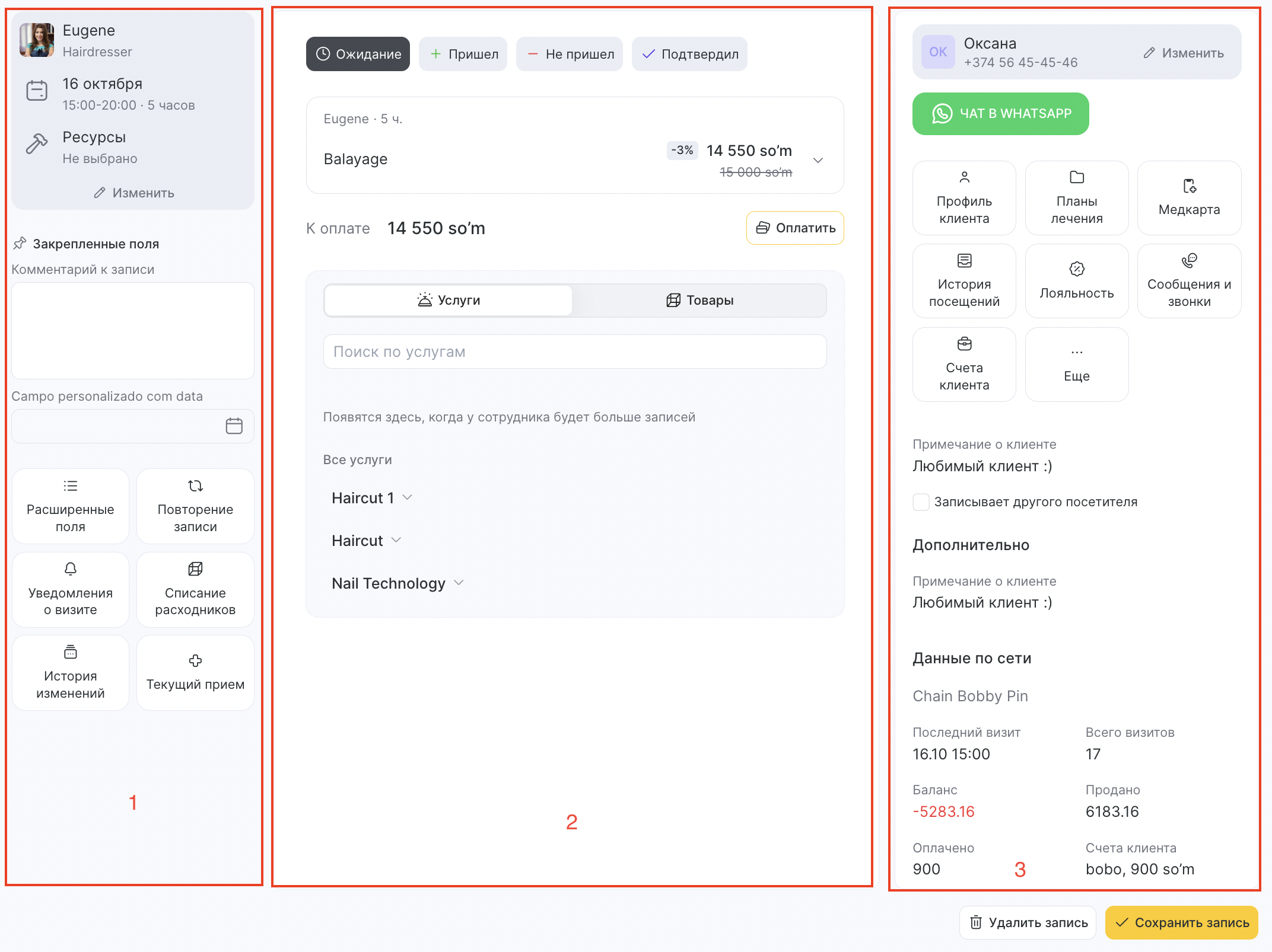 В центральной части оставили все необходимое для основной работы с записью: со статусами визита, услугами, товарами и оплатой.