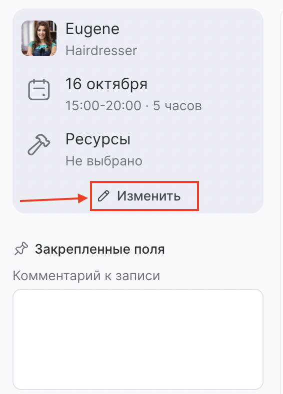 В левом верхнем углу окна записи расположен блок с сотрудником, на которого создана запись, и датой, временем и длительностью записи. Теперь нет необходимости пролистывать страницу вниз и искать все эти поля в центральной части окна. По умолчанию этот блок свернут, но его можно развернуть, нажав на кнопку Изменить, чтобы отредактировать данные.