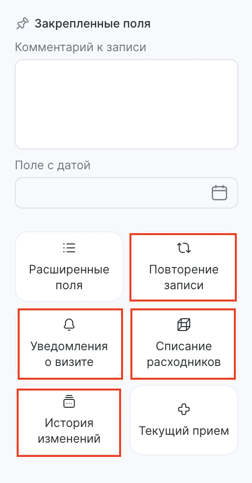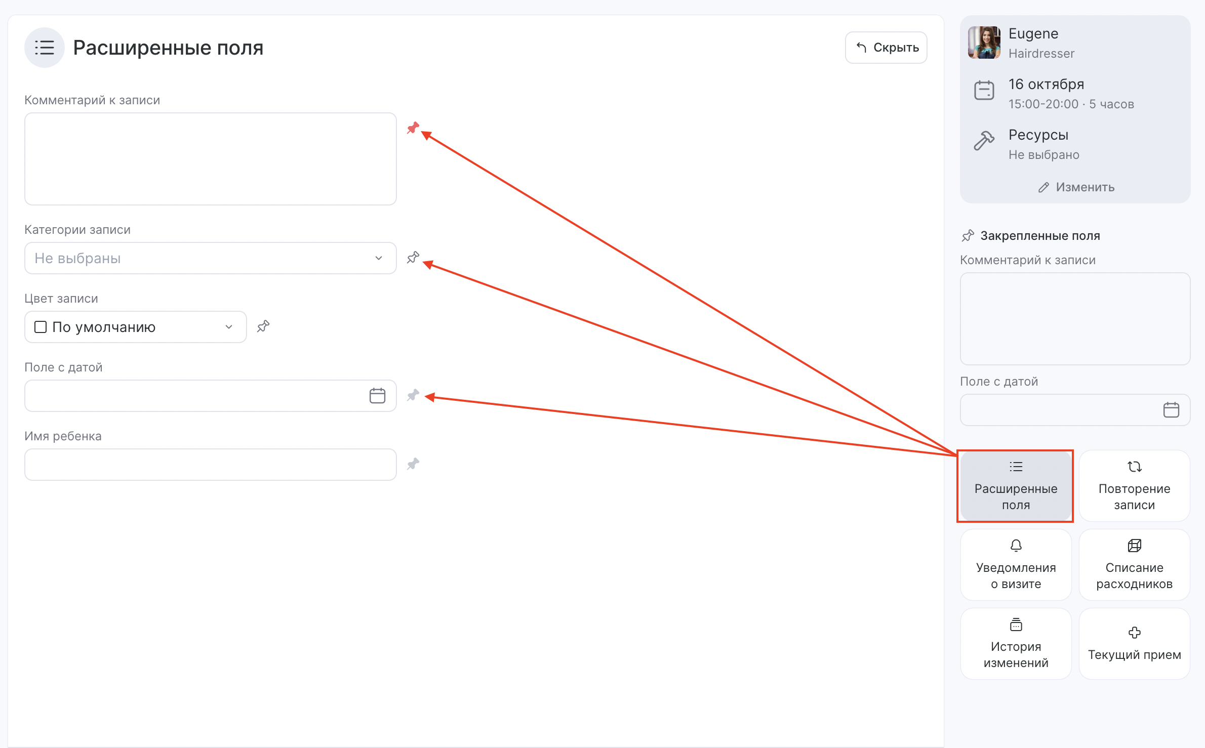 Чтобы закрепить или открепить поле, перейдите в блок «Расширенные поля» и напротив нужного поля нажмите на значок кнопки. Изменения сразу отобразятся на левой части окна записи.