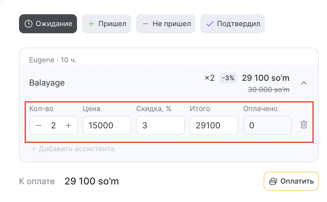 Добавленную в запись услугу можно удалить через кнопку с изображением корзины, изменить количество, цену, скидку и сумму к оплате.