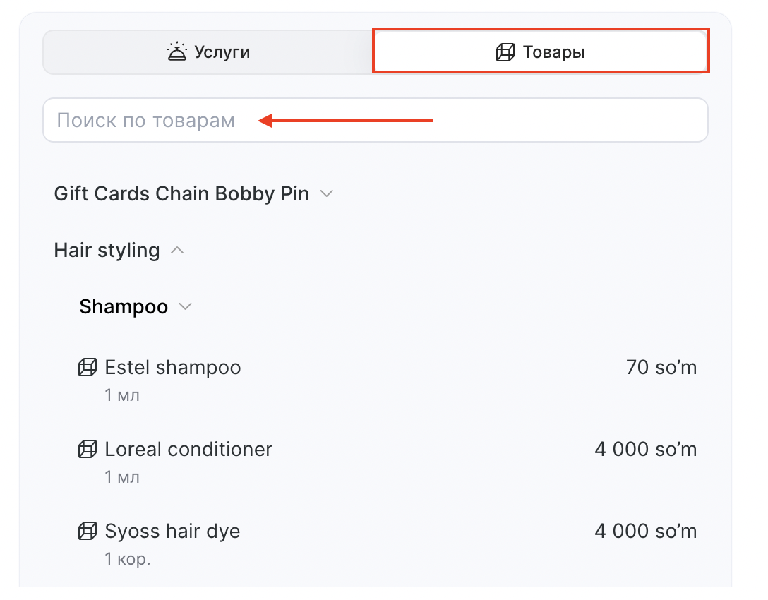 Товары можно добавлять в запись при помощи поиска — по умолчанию в строке поиска выбираются услуги, но их можно сменить на товары. Для этого нужно выбрать вкладку «Товары». В строке поиска можно переключаться между услугами и товарами в любое время. Также товары можно добавить, выбрав их из списка в нижней части окна.