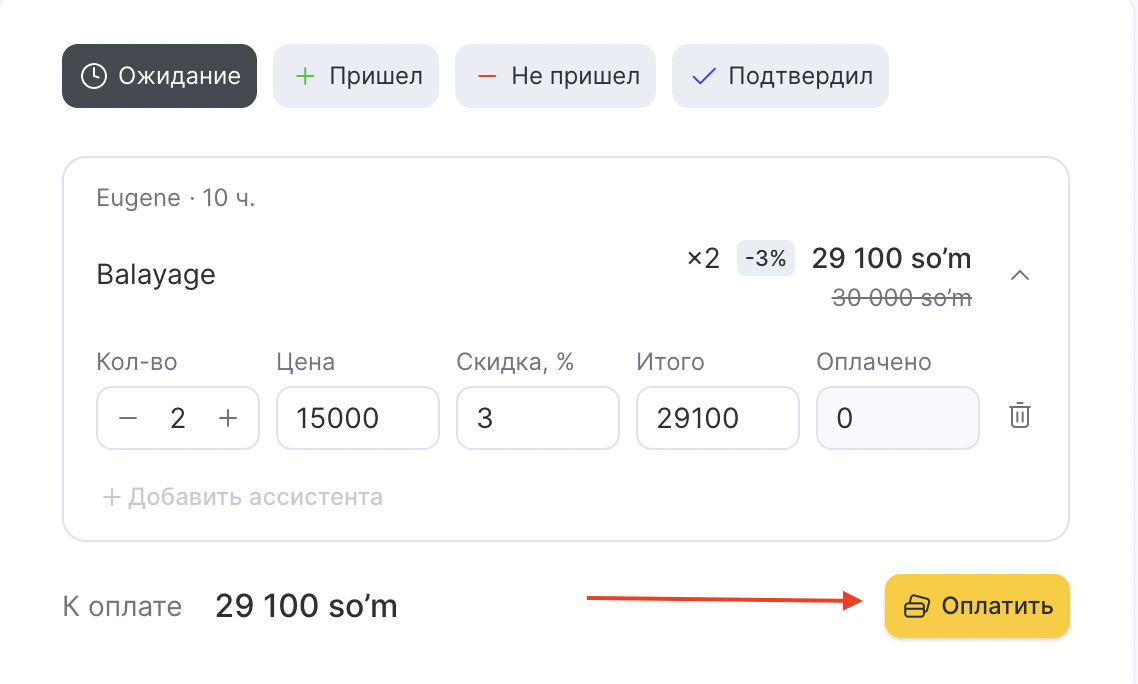 В центральной части окна записи можно изменить статусы визита, добавить новую услугу или товар в запись, отредактировать данные об услуге или товаре в записи, а также сразу перейти к оплате. В новой версии окна записи больше нет отдельных вкладок «Статус визита» или «Оплата визита».
