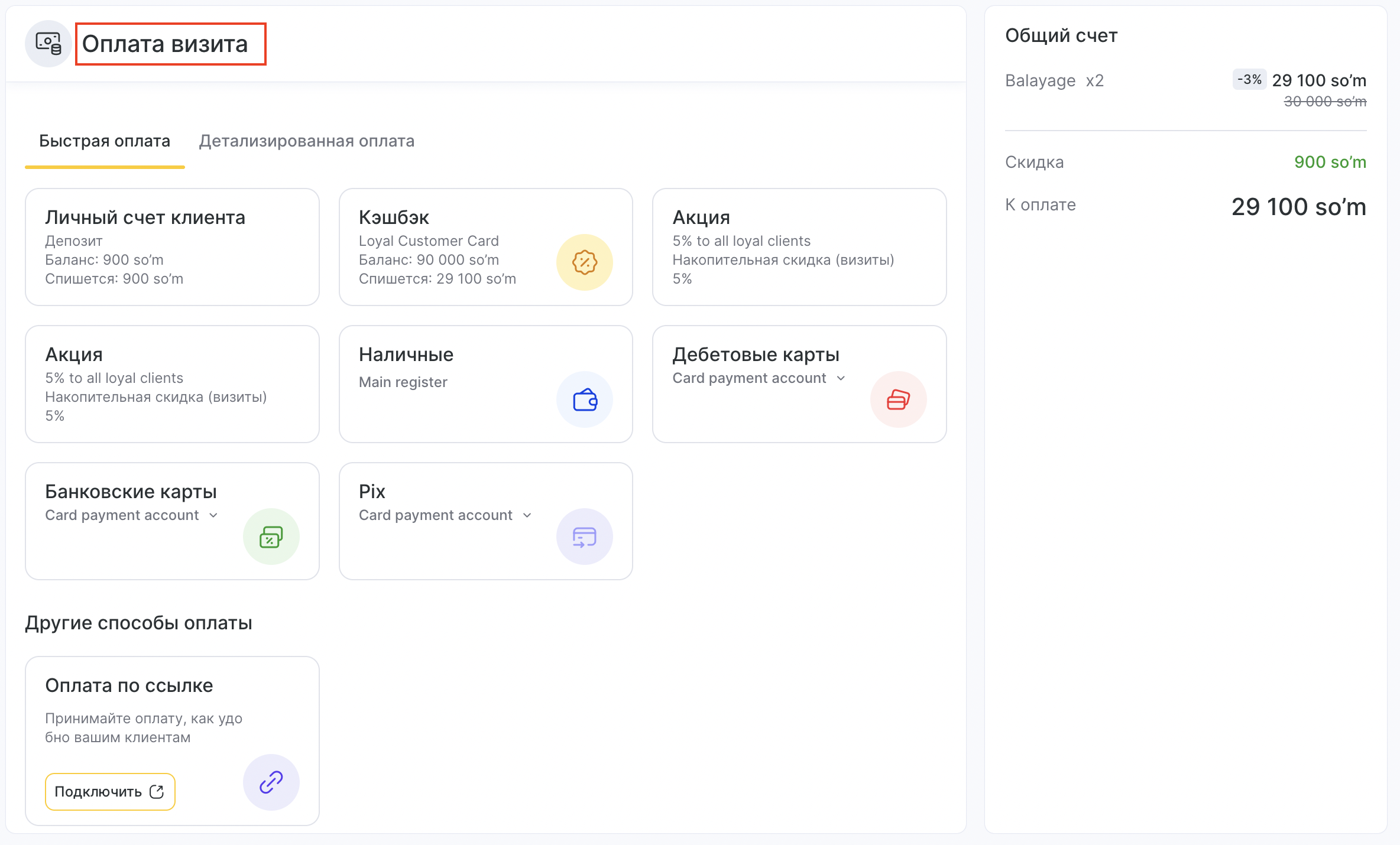 После перехода к оплате откроется раздел оплаты визита, в этом разделе можно провести оплату любым доступным способом на вкладках: Быстрая оплата или стандартные способы для оплаты — банковской картой и наличными. При оплате также можно изменить кассу. Если у клиента имеется лояльность, которой можно оплатить визит (карта лояльности, абонемент, сертификат или личный счет), то ее также можно применить на этой вкладке.