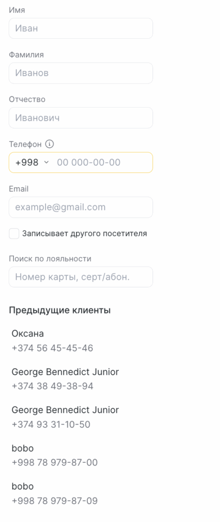 Фамилия и/или отчество — если поля включены в настройках журнала записи, подробнее о фамилии и отчестве клиента читайте в статье.
