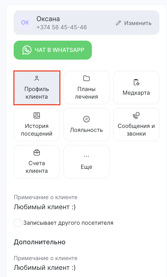Дополнительные поля для клиента — если включены в сети или настройках онлайн-записи, подробнее о дополнительных полях читайте здесь.