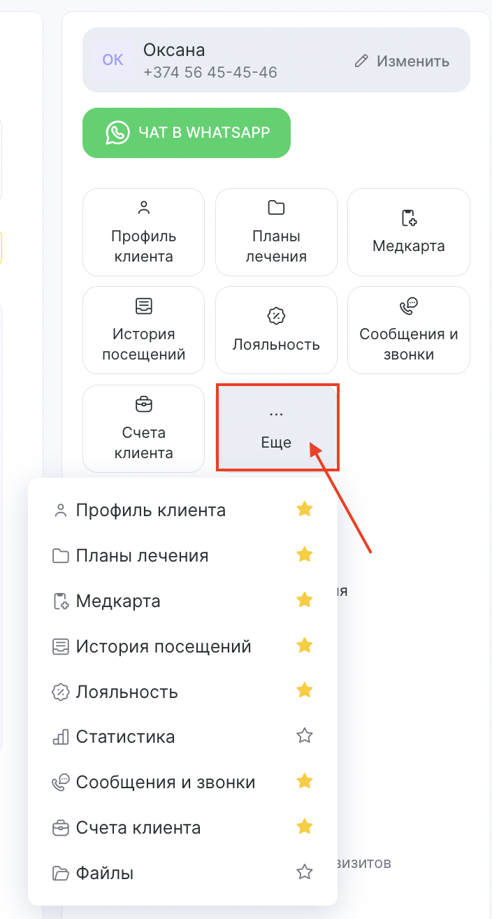 Разделы для работы с клиентом можно добавить в избранное, нажав на звездочку рядом с его названием, после избранные разделы будут отображаться в общем меню без перехода к списку разделов (то есть без лишних нажатий на кнопку с тремя точками).