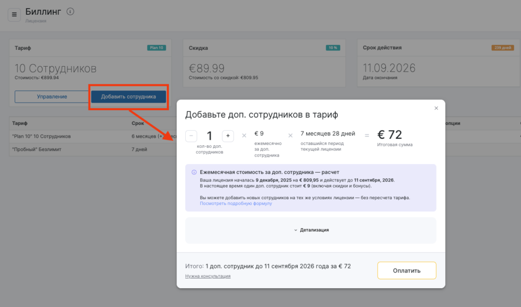 Стоимость докупки сотрудника рассчитывается автоматически на основе последней приобретенной лицензии — без учета предыдущих лицензий и их бонусных месяцев.