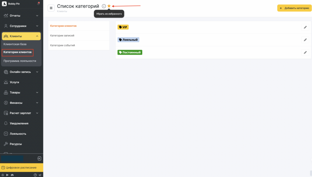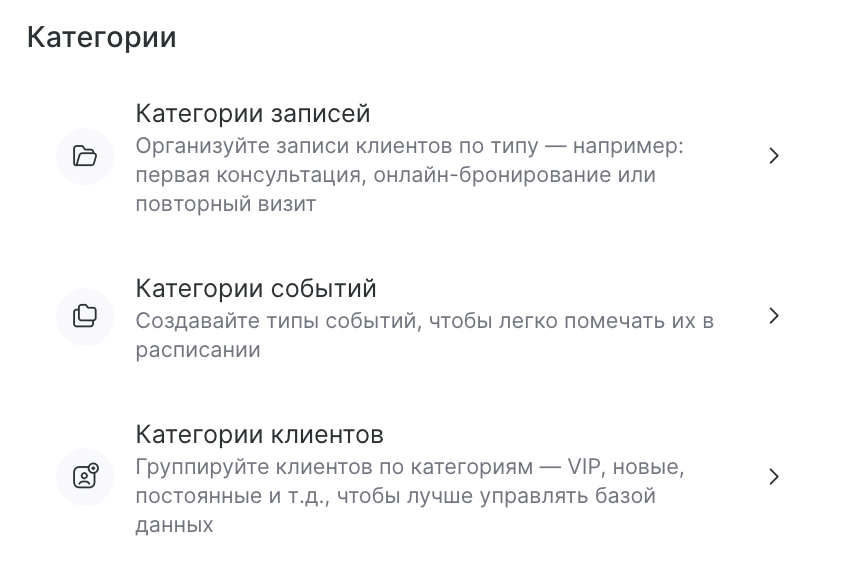 - Категории клиентов — группы клиентов (VIP, новые, постоянные и т. д.).