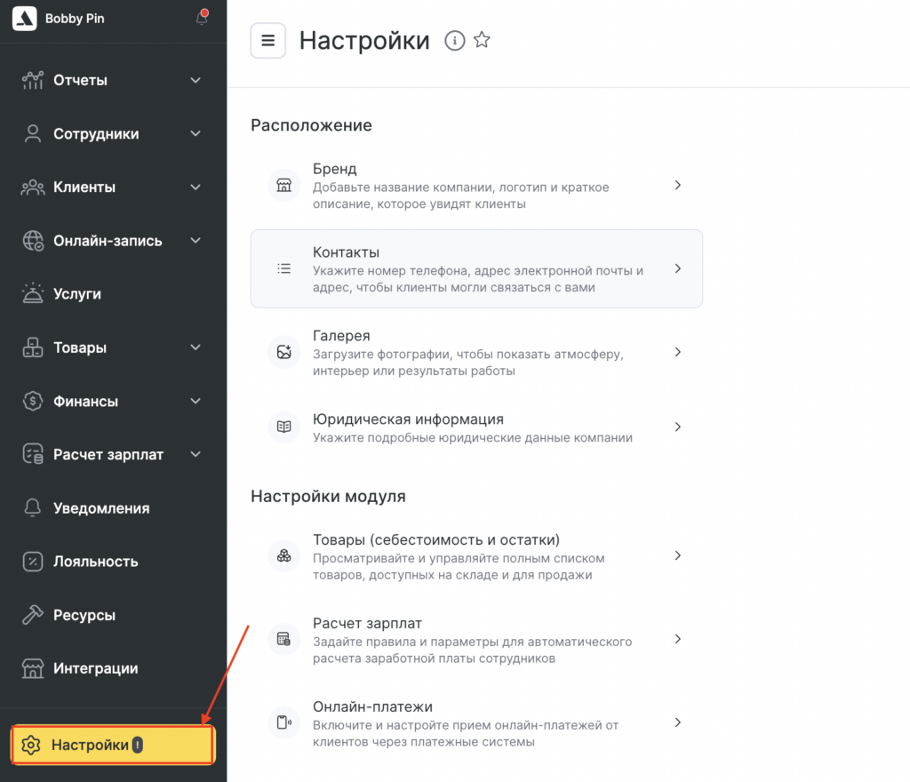 - настройки, интеграции, финансовые правила и другое