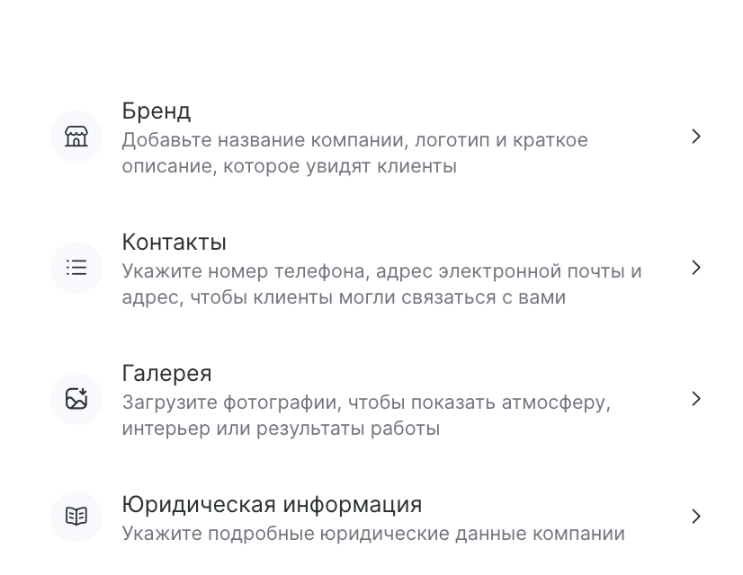 - Бренд — название компании, логотип, короткое описание для клиентов;