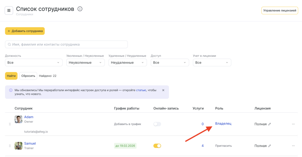 Ситуация: сотрудник является владельцем компании, но также оказывает услуги клиентам и стоит в расписании (на него ведётся запись).