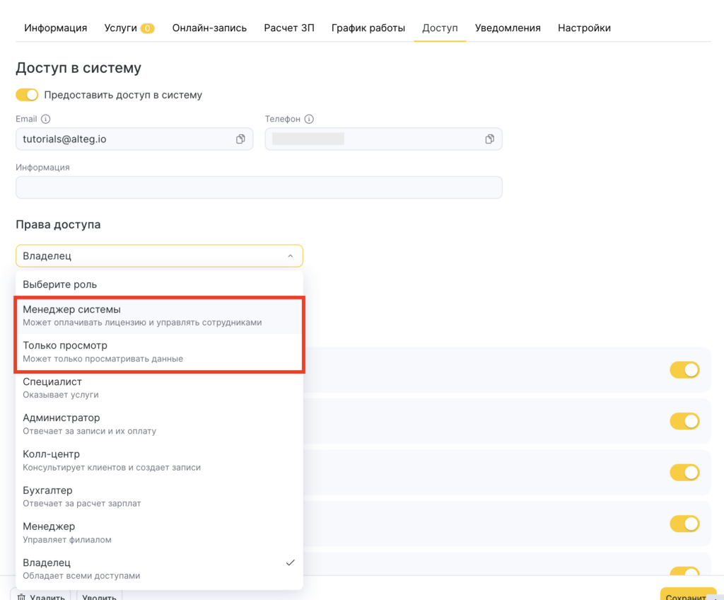 Если вы не уверены, как лучше настроить права, обратитесь к вашему персональному менеджеру в Altegio. Контакты доступны в разделе Обзор > Сводка.