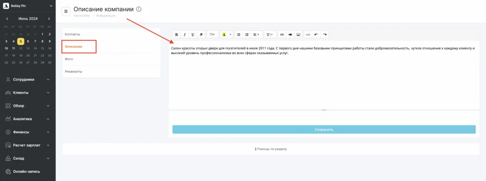 После настройки контактной информации добавьте описание компании.