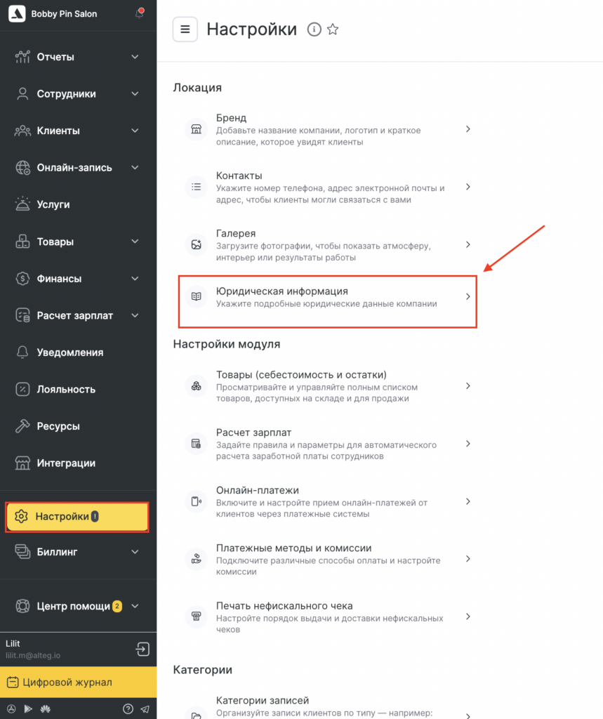 - Перейдите в основном меню в раздел Настройки > Локация > Юридическая информация.