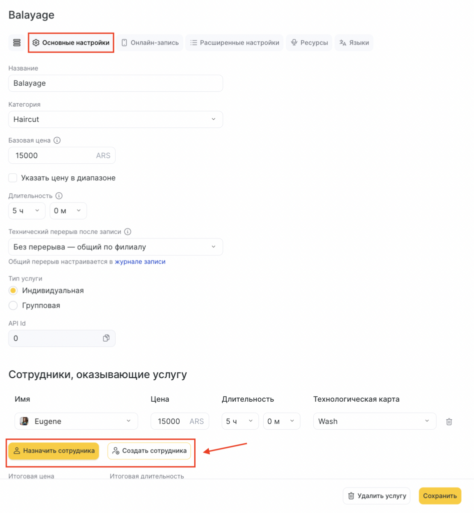 - Для того чтобы добавить сотрудника к услуге, перейдите во вкладку Основные настройки в настройках услуги.