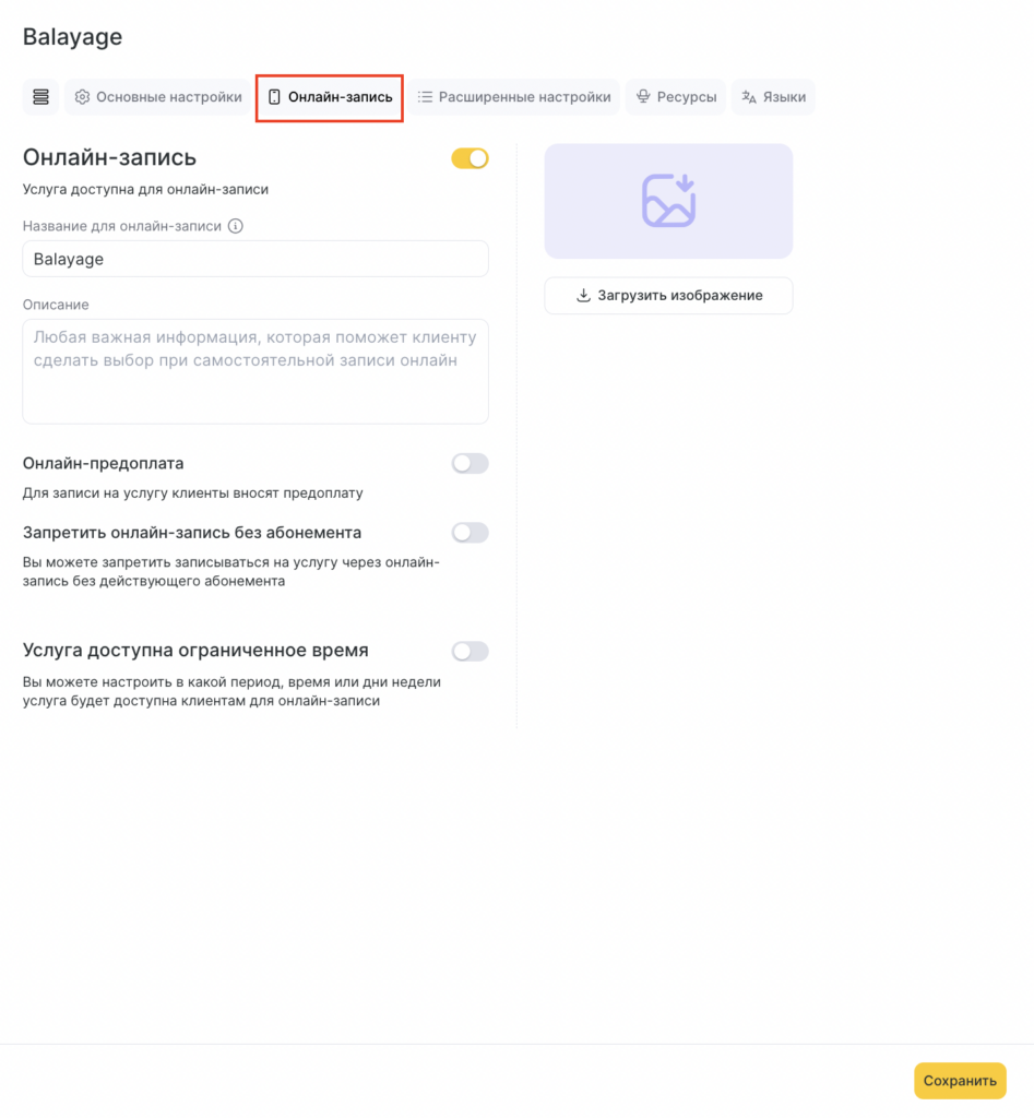 - Укажите, будет ли услуга отображаться в Онлайн-записи.