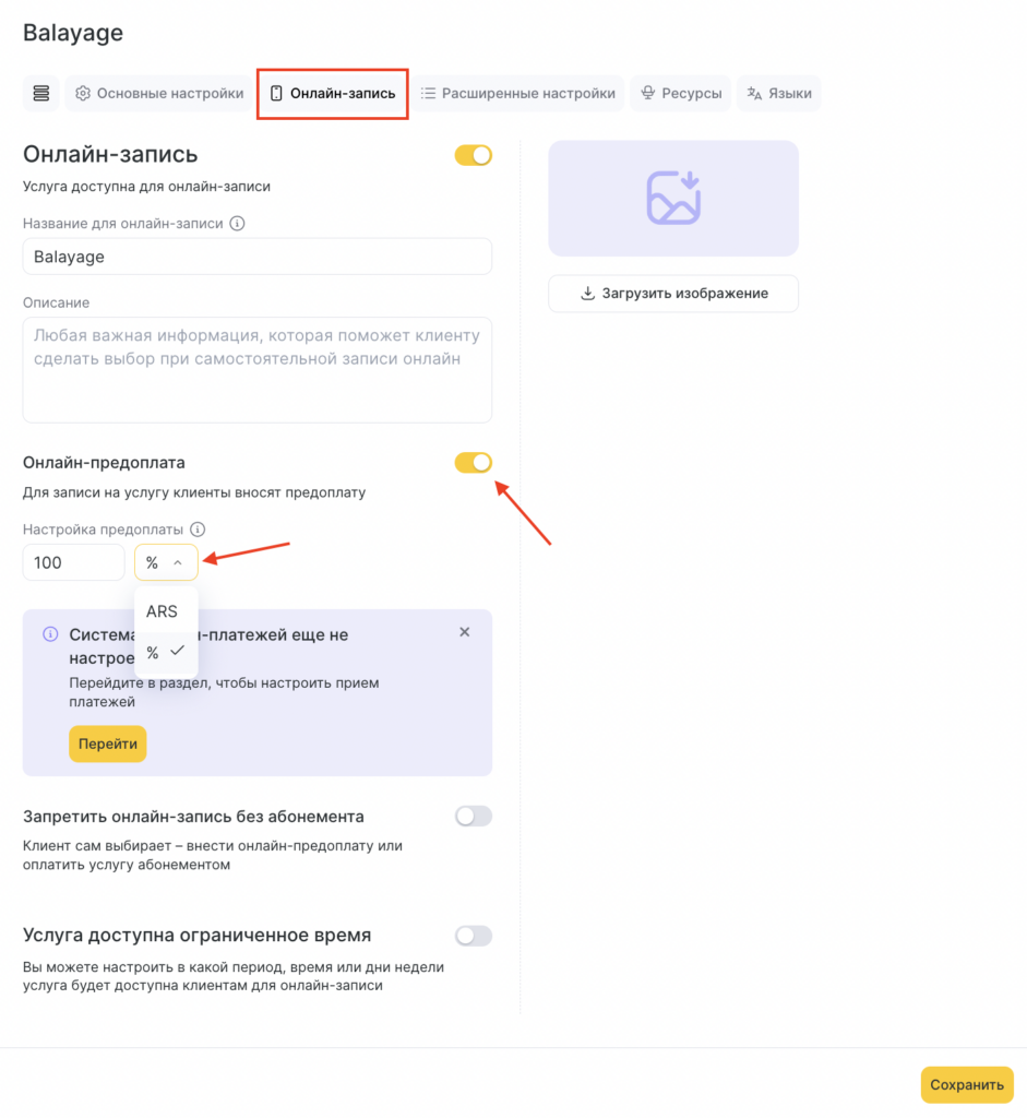 - Для онлайн-предоплаты необходимо переключить соответствующий ползунок в поле Онлайн-предоплата. При включенной онлайн-предоплате, клиенты смогут оплатить услугу в виджете онлай-записи.