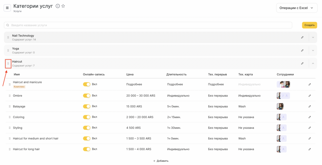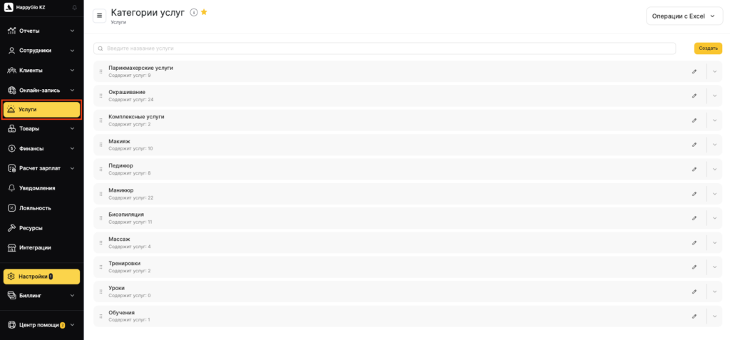 После того как Категории добавлены и настроены, добавьте и настройте Услуги в каждой категории.