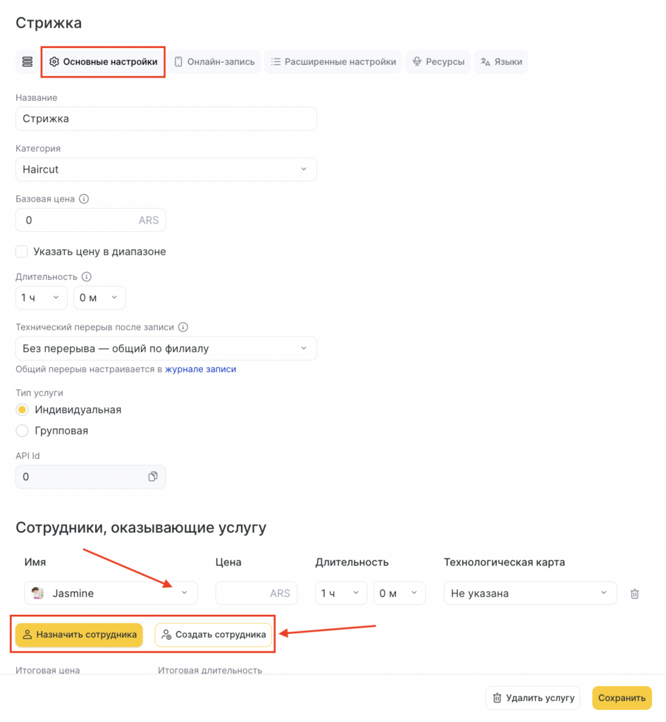 - В новом окне сразу откроется вкладка Основные настройки, чтобы назначить сотрудника на услугу, нажмите кнопку Назначить сотрудника. (Вы также можете создать нового сотрудника, не выходя из раздела, нажав на кнопку Создать сотрудника.)