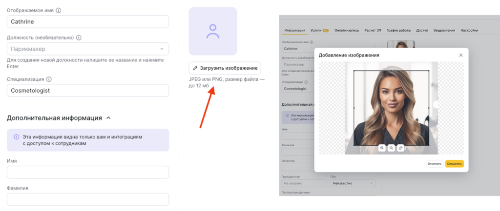 Для загрузки фотографии нажмите кнопку Загрузить изображение/Изменить изображение под иконкой человека. Вы можете приблизить, отдалить и повернуть его влево/вправо.