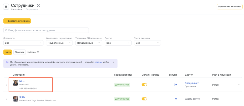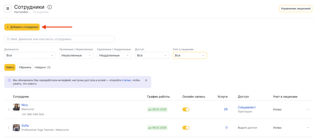 Подробнее о ролях сотрудников и правах доступа читайте в статье.