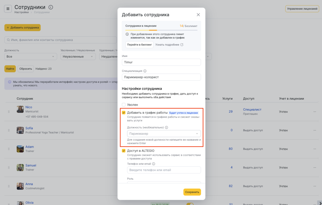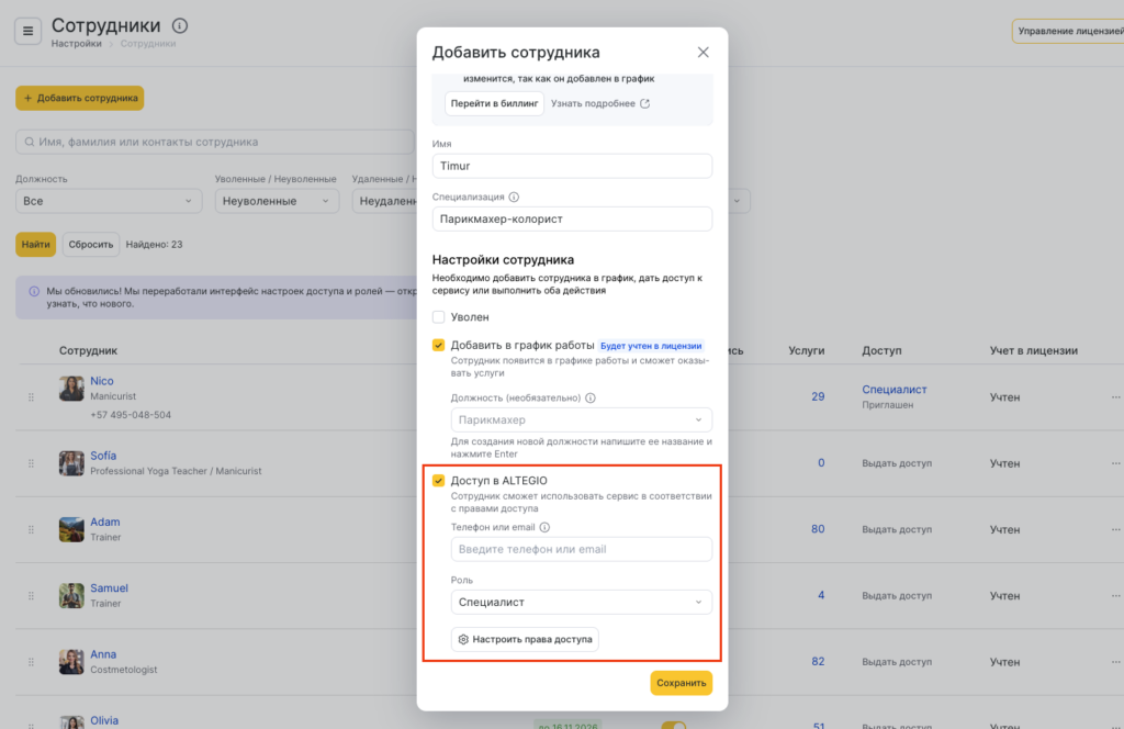- Доступ в Altegio — предоставьте сотруднику доступ к системе, чтобы он смог пользоваться сервисом согласно назначенным правам доступа, например, просматривать свое расписание, отчеты и т.д.