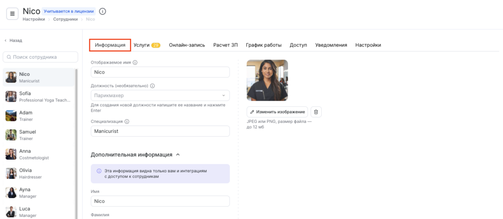 - На вкладке Информация вы можете отредактировать основные данные сотрудника, такие как имя, должность, специализация, контактная информация и фото профиля.