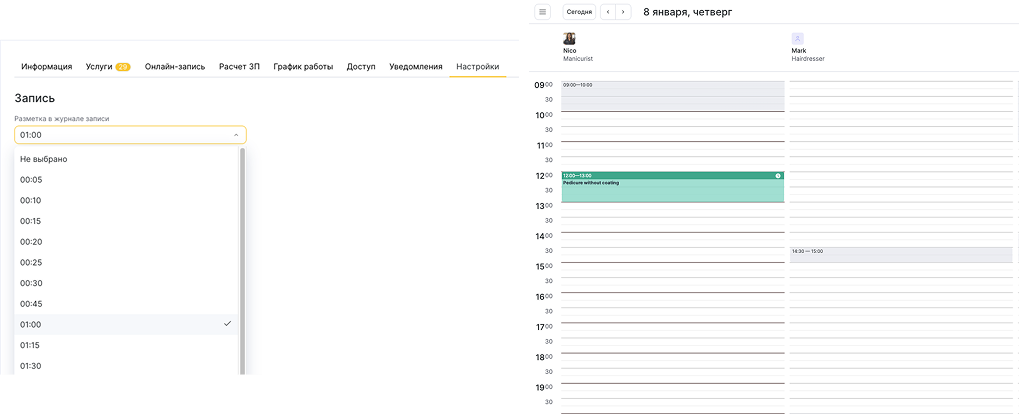- В блоке Запись вы можете добавить разметку в журнале записи. Она позволяет визуально разделить день на интервалы. Разметка необходима для того, чтобы администратор мог записывать клиентов наиболее эффективно. Обычно разметка в журнале записи формируется исходя из длительности самой популярной из самых прибыльных услуг, и все расписание сотрудника подстраивается под эту услугу, чтобы на нее можно было создать как можно больше записей.
