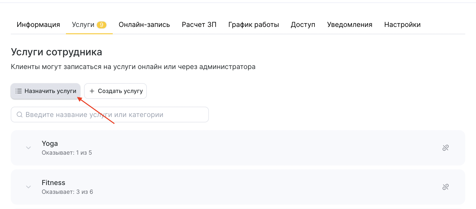 4. Дополнительно вы можете назначить сотрудникам услуги из существующих категорий. Для этого нажмите кнопку «Назначить услуги».