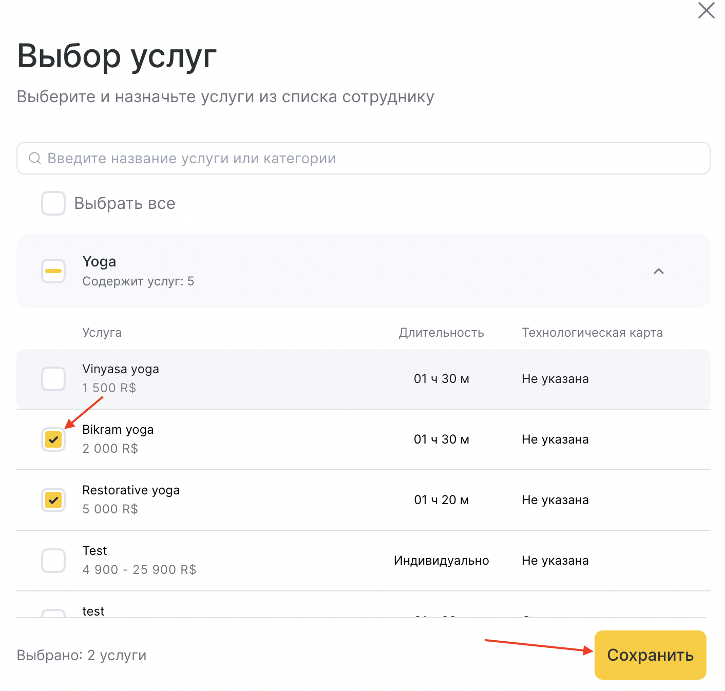 В открывшемся модальном окне нажмите на название категории и установите флажок рядом с каждой услугой, которую вы хотите назначить сотруднику. Вы можете назначить все услуги сразу, установив самый верхний флажок.