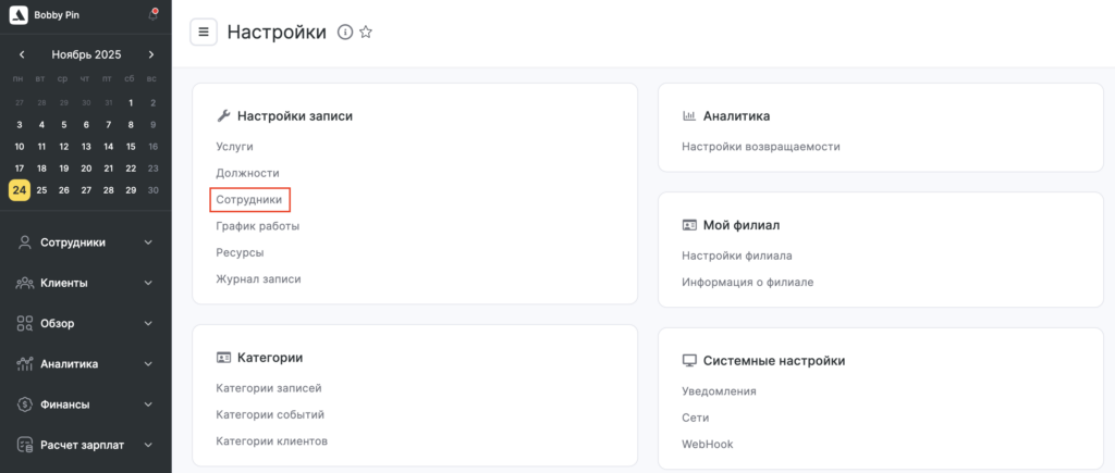 - В разделе Настройки > Настройки записи > Сотрудники. Такой вариант удобнее использовать, если в компании много услуг и мало сотрудников. Этот способ описан ниже.