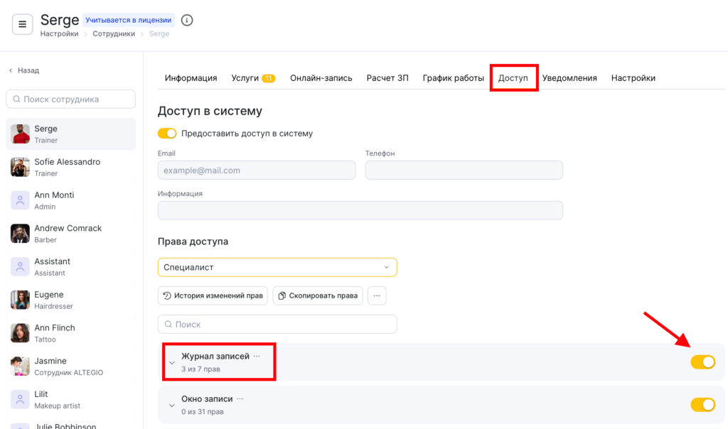 - Перейдите в Настройки > Сотрудники, выберите нужного сотрудника и откройте вкладку Доступ.