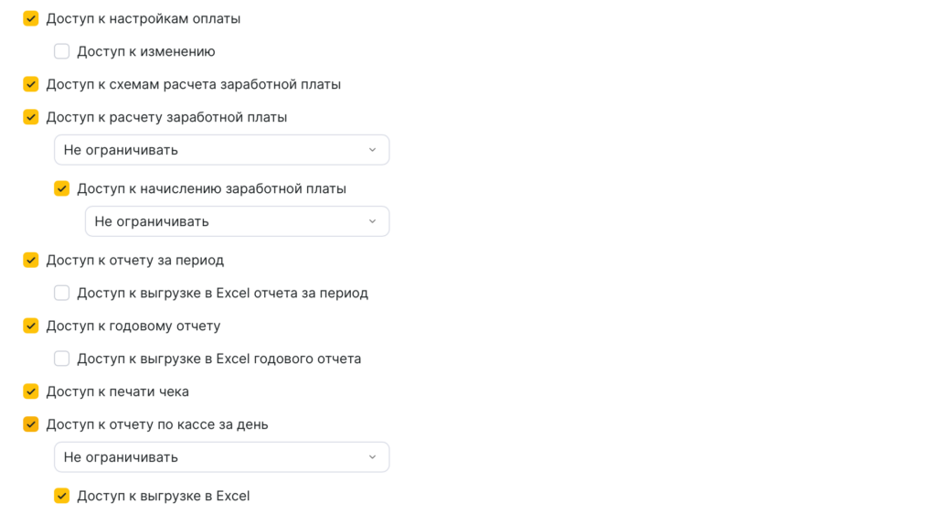 Доступ к выгрузке в Excel отчета за период — разрешает сотруднику выгружать финансовый отчёт за период в формате Excel.