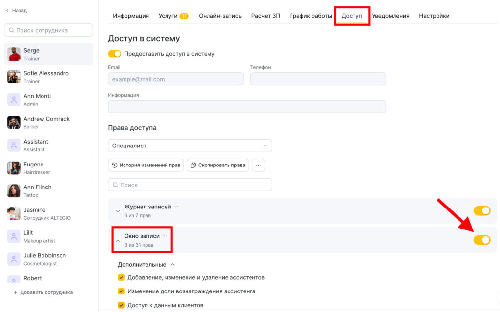 - Найдите необходимый блок прав и активируйте его с помощью ползунка, после чего нажмите на название блока Окно записи и включите конкретные права, которые хотите предоставить сотруднику.