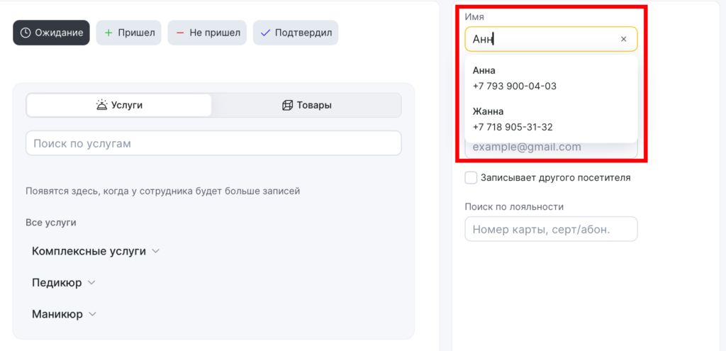 Выпадающий список клиентов — это список уже существующих клиентов из базы, который появляется при поиске по данным клиента (имя, email, а также номер телефона, фамилия, отчество и информация по лояльности — если у сотрудника есть соответствующие права).