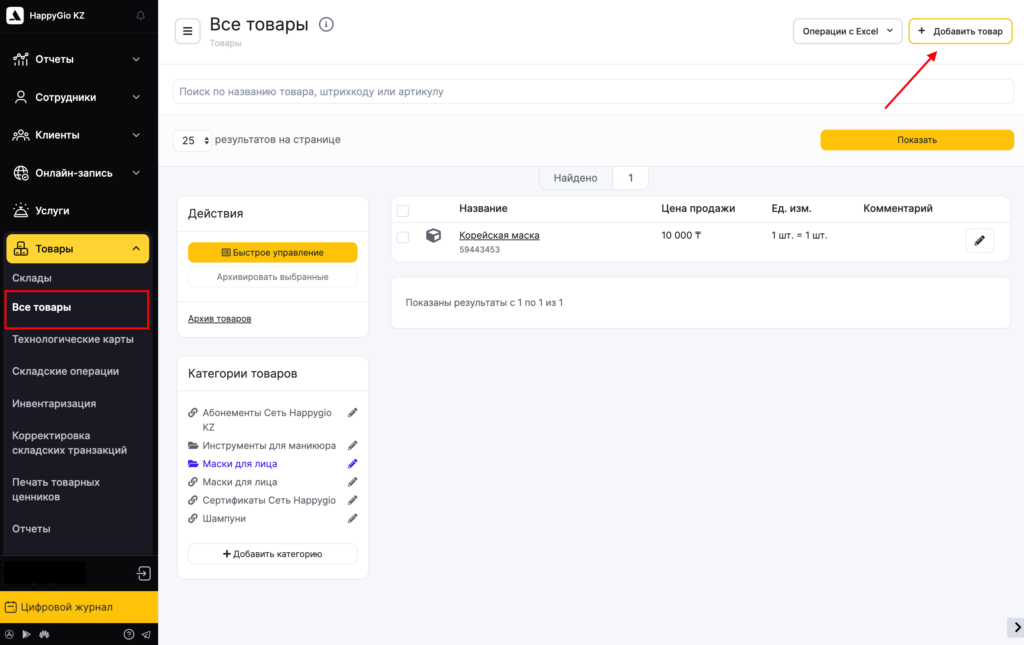 После создания и настройки категорий добавьте товары на склады. Товары можно добавлять по отдельности или списком через Excel (подробнее о том, как добавить товары через Excel читайте здесь).