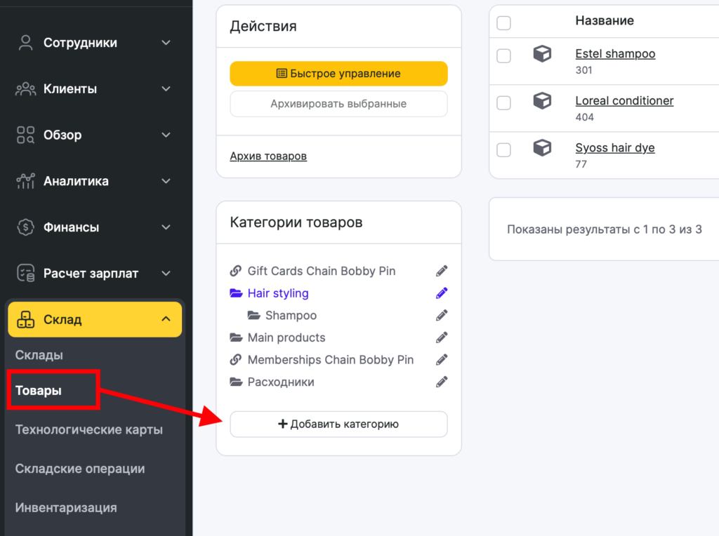 - Перейдите в раздел Склад > Товары.