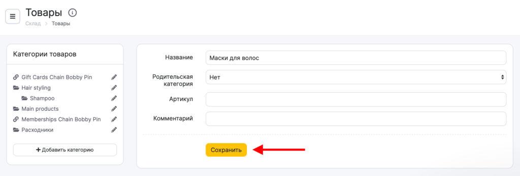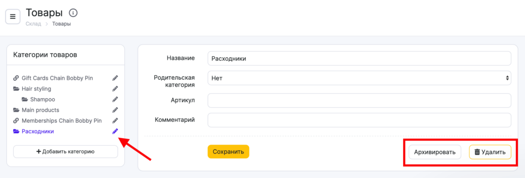 Информацию обо всех категориях товаров можно редактировать. Для этого выберите категорию, нажмите на иконку карандаша рядом с ее названием, в открывшемся новом окне измените название, родительскую категорию, артикул и комментарий, нажмите кнопку Сохранить.