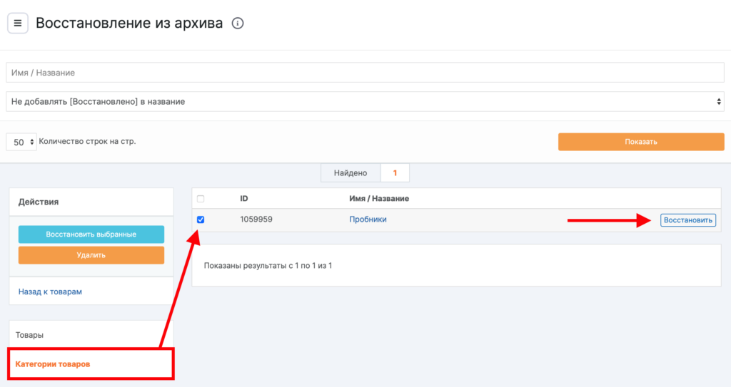 Чтобы разархивировать или безвозвратно удалить категорию, перейдите на вкладку Архив товаров. На вкладке Категории товаров восстановите категории по одной или выберите несколько категорий (отметьте галочками) и нажмите кнопку Восстановить выбранные или кнопку Удалить. Чтобы вернуться к списку товаров, нажмите кнопку Назад к товарам.
