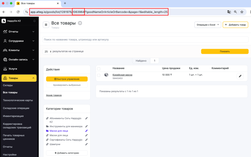 ID категории — это ее уникальный номер в Altegio. Чтобы определить ID категории, перейдите в основном меню в раздел Товары > Все товары, нажмите на название нужной категории.