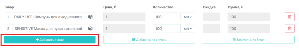 Нажмите кнопку Добавить товар и введите название или артикул товара (подробнее о настройке каталога товаров читайте здесь).