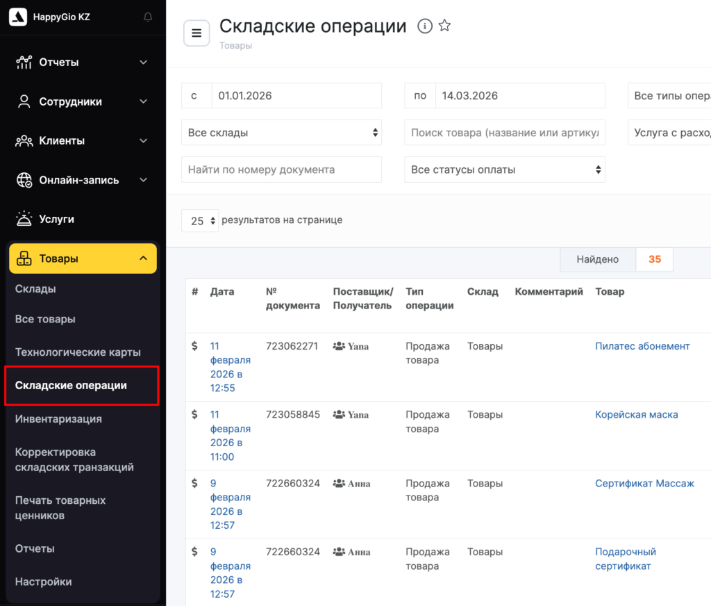 - Нажмите кнопку Операции с товарами.
