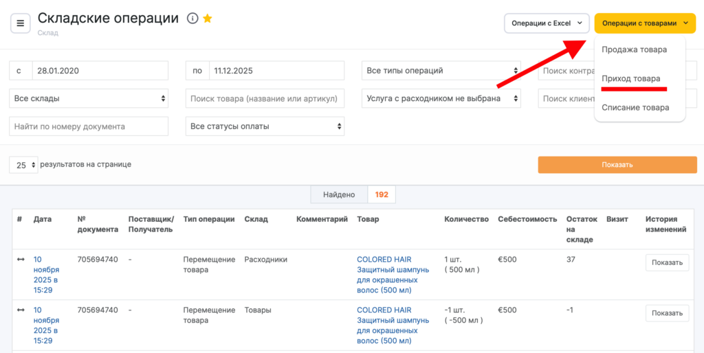 Приход товара на склад создает одновременно две операции: складскую и финансовую. Все данные об этих операциях вы можете просмотреть в разделах Склад > Складские операции и Финансы > Финансовые операции.
