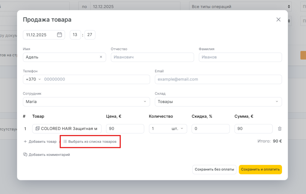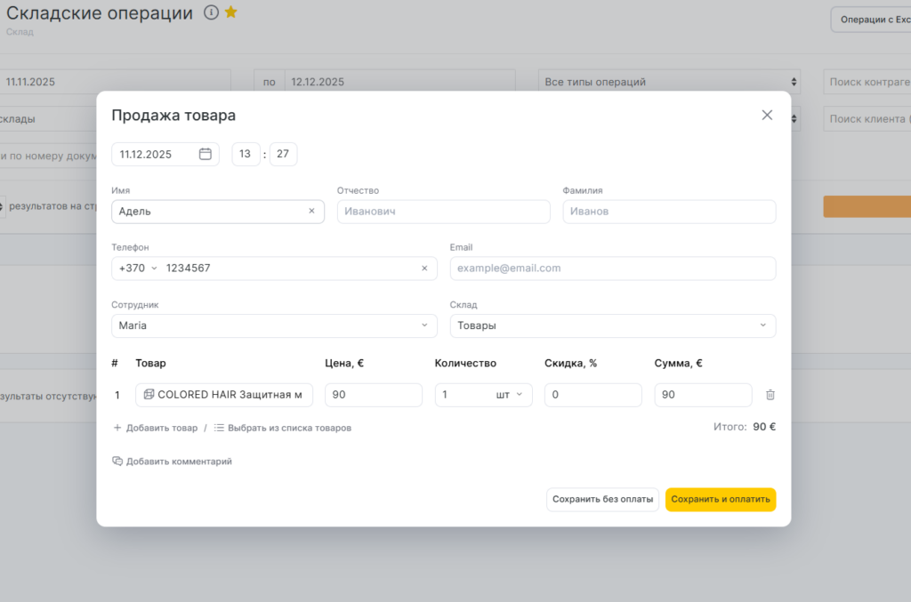 - В открывшемся окне укажите дату и время создания складской операции (будут автоматически выбраны текущая дата и время). Введите и выберите имя или номер телефона клиента, которому был продан товар (это поле заполнять необязательно). Выберите сотрудника, который продал товар, и склад (склад обязательно должен быть с типом Для продажи товаров).
