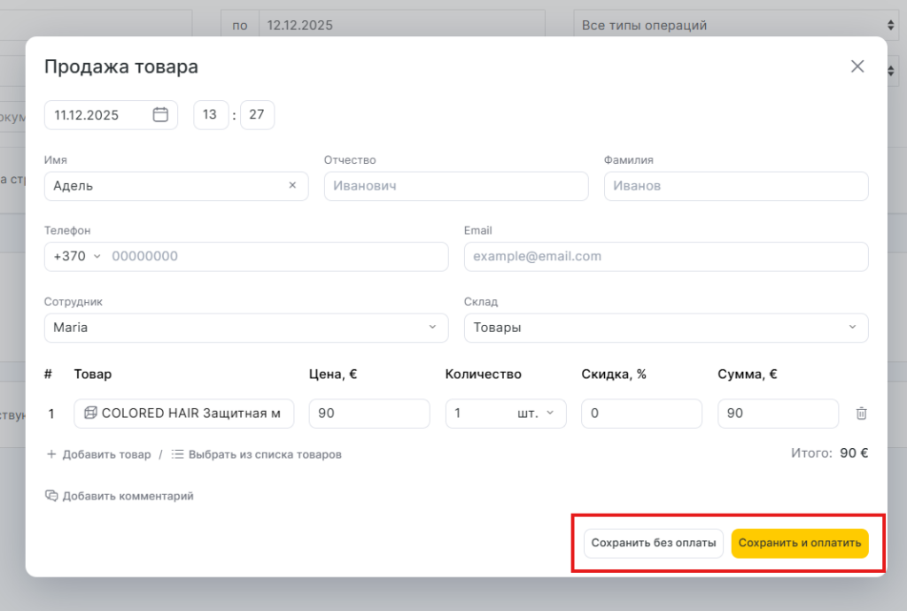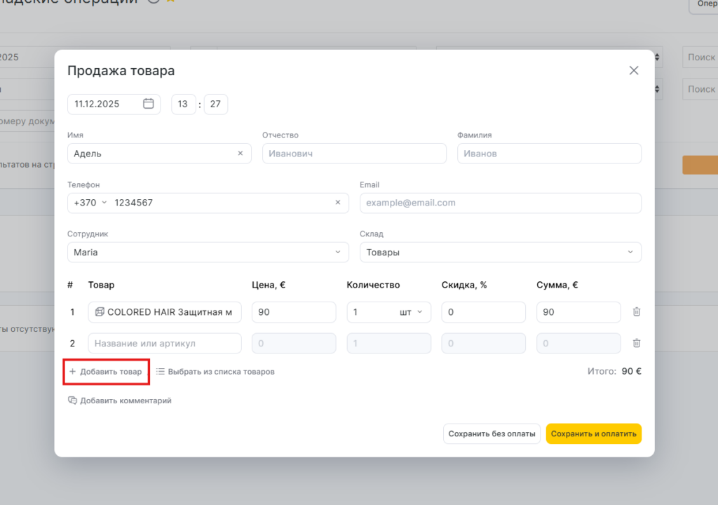 - Чтобы сохранить складскую операцию, нажмите на кнопку Сохранить без оплаты. В таком случае продажа товара будет создана без оплаты. Если нужно перейти к оплате, нажмите Сохранить и оплатить.
