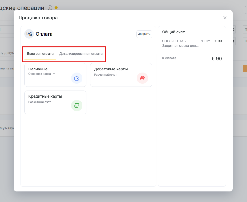 Для смешанной оплаты перейдите во вкладку Детализированная оплата.