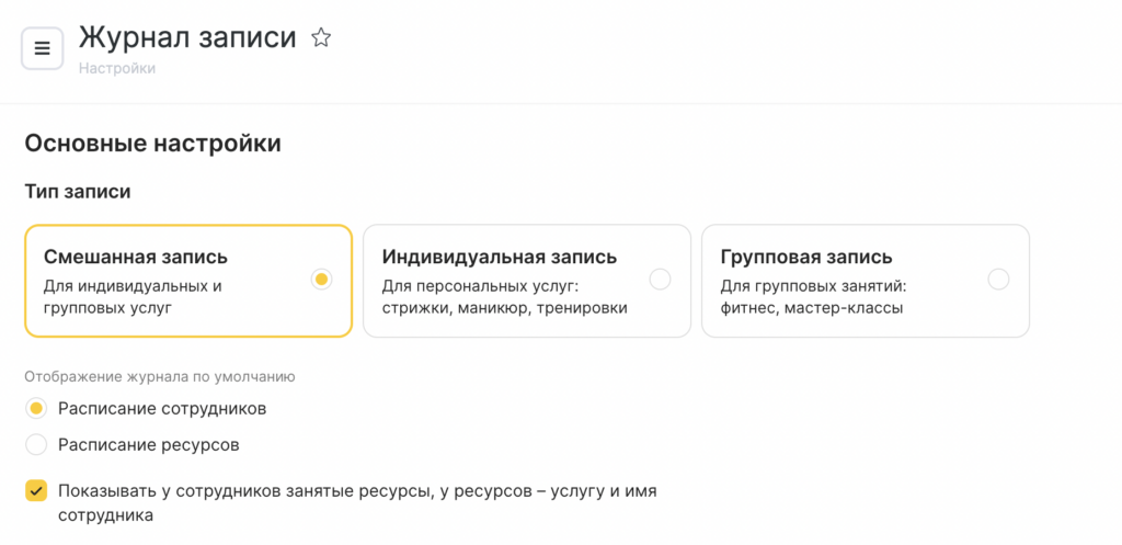 3. Поставьте при необходимости галочку Показывать в расписании сотрудника занятые им ресурсы, в расписании ресурса — название услуги и имя сотрудника. Данная функция помогает сократить переключения между режимами журнала для ускорения записи администратором и быстрой навигации клиента в нужный зал/на нужный ресурс.